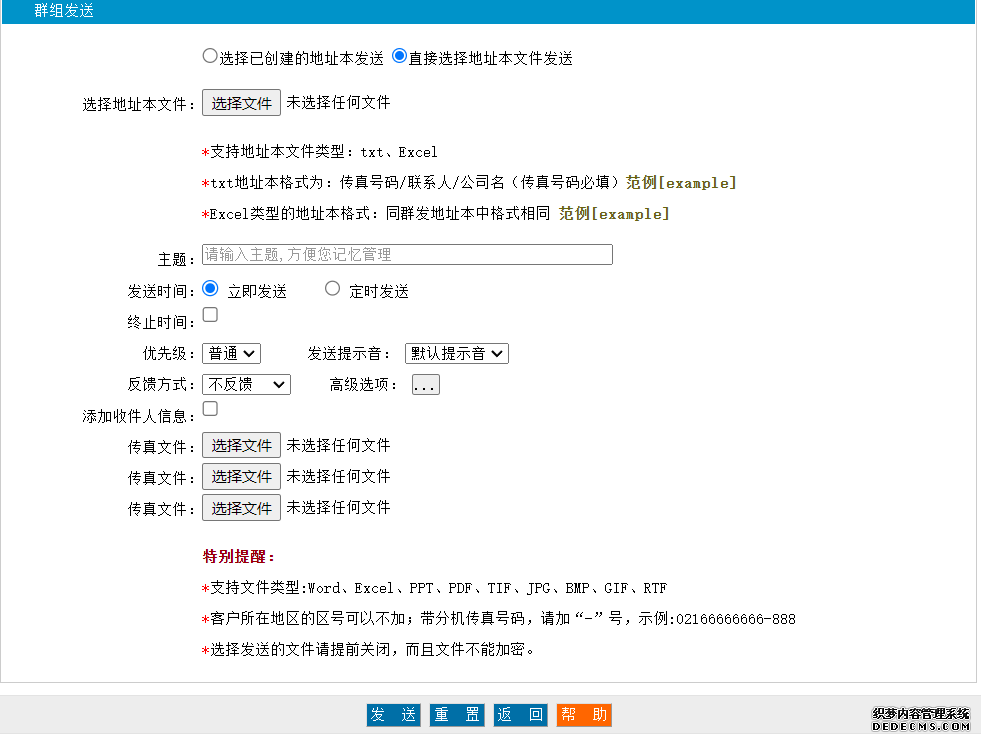用巨象網(wǎng)絡(luò)傳真平臺(tái)群發(fā)傳真,操作非常方便,你只需要將你發(fā)送的號(hào)碼導(dǎo)入系統(tǒng)構(gòu)建地址本,或者選擇你的地址本文件,再選擇你要發(fā)送的文件,如下圖所示,點(diǎn)發(fā)送即可完成群發(fā)傳真操作。