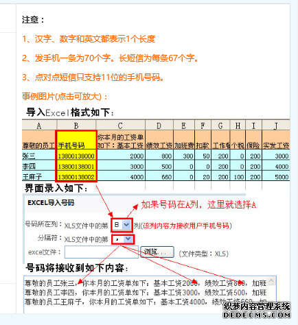 工資條短信是個性化變量短信中的一種,使用巨象企信通平臺的訂制短信功能可以一次性批量群發各類變量短信,即一次批量群發的手機號碼收到的內容不完全一樣,如內容里加入稱呼、工資條、物業費、賽事編號、座位號、學號等。有三種個性化變量短信提交方法,用戶可根據您自身資料格式選擇其中一種。
